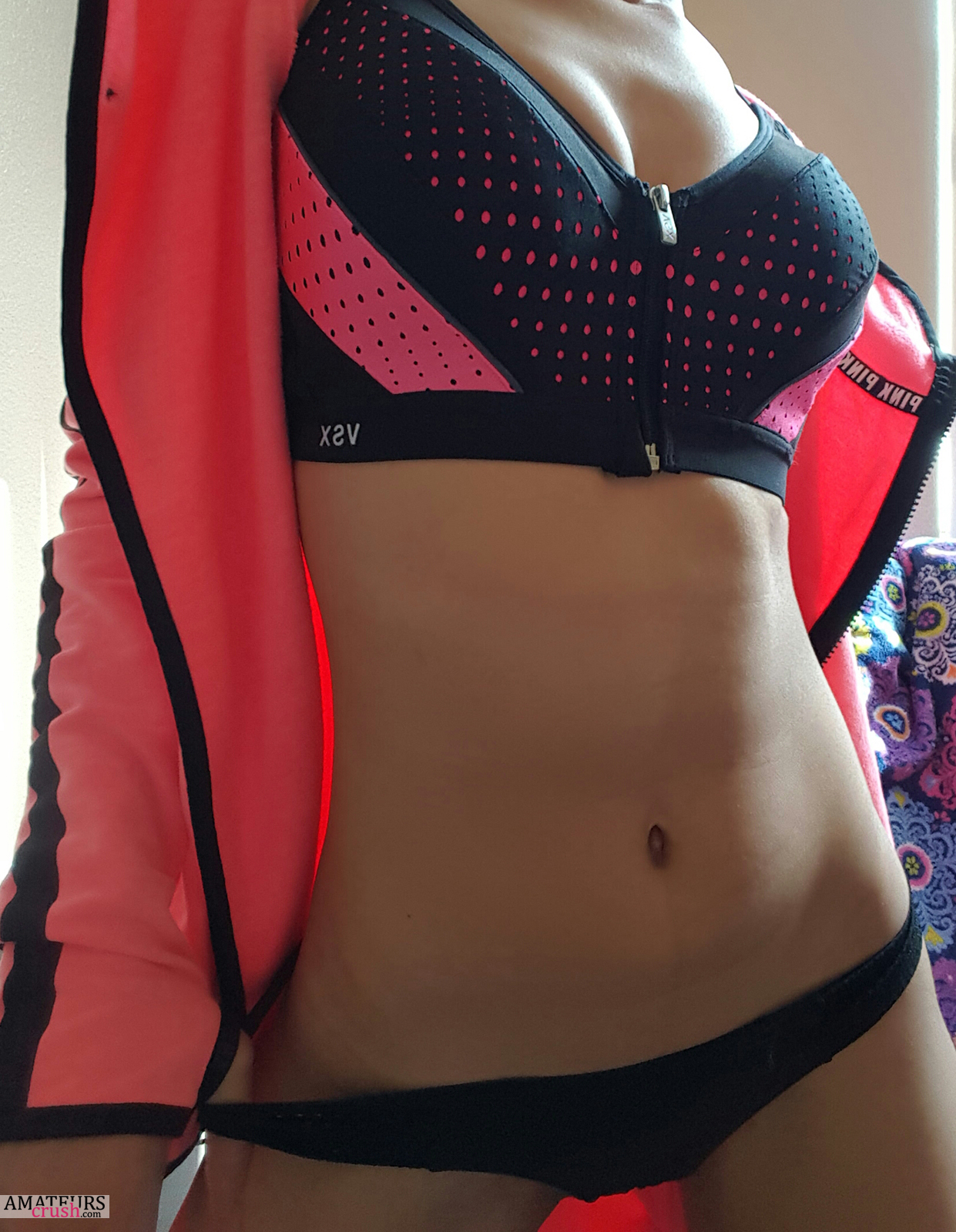 Next up, we got a nice teasing pic of her unzipping that sports bra. I bet you want to see her beautiful perky tits what I was talking about earlier..